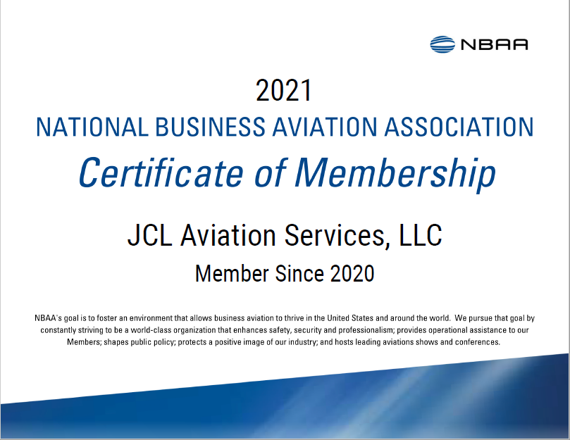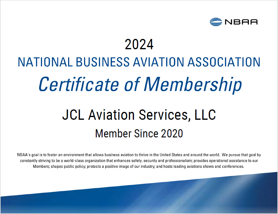 JCL Aviation Services is pleased to celebrate our fourth anniversary as a member of the National Business Aviation Association (NBAA). For over 75 years, NBAA has been the leading trade organization for companies that rely on general aviation aircraft to help make their businesses more efficient, productive, and successful. As an aviation services provider, JCL is proud to be a member and supporter of NBAA. For more information about the association, visit https://nbaa.org/