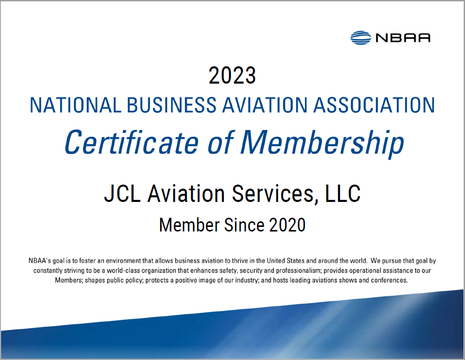 JCL Aviation Services is pleased to commemorate our third anniversary as a member of the National Business Aviation Association (NBAA). The association is celebrating its 75th year of working to foster an environment that allows business aviation to thrive in the United States and around the world. As an aviation services provider, JCL is proud to be a member and supporter of this leading organization in our industry. For more about NBAA, visit https://nbaa.org/